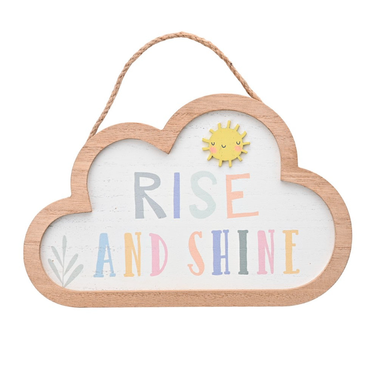A lovely hanging sign by Petit Cheri with ‘Rise and Shine’ painted in a colourful design.